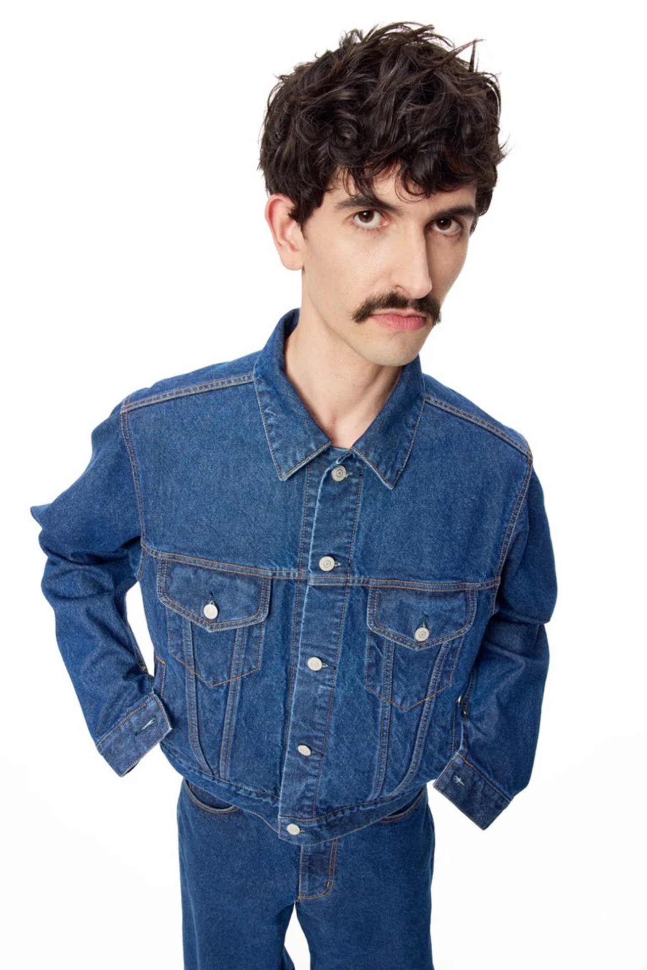 バイオウォッシュを施したモデル。すっきりとしたボックスシルエット。