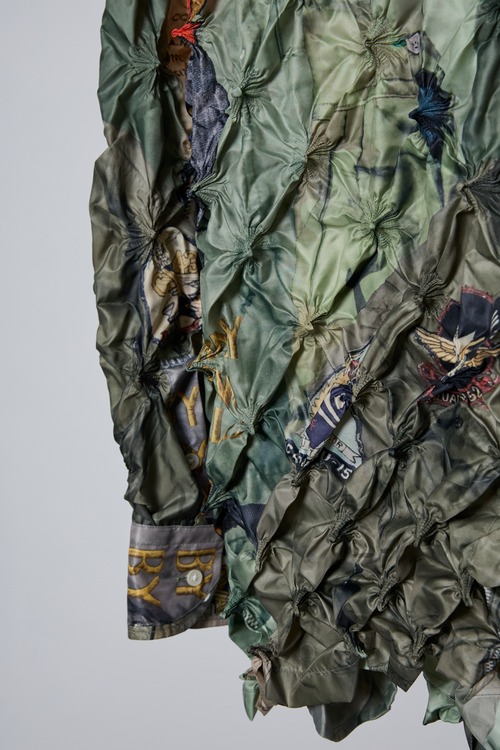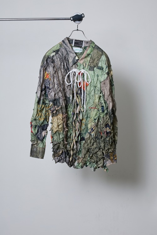 ヴィンテージデニムやワッペン、ピンバッジ、ミリタリーウエアなどをコラージュしたプリント生地を使用した、唯一無二の存在感を放つシャツ。