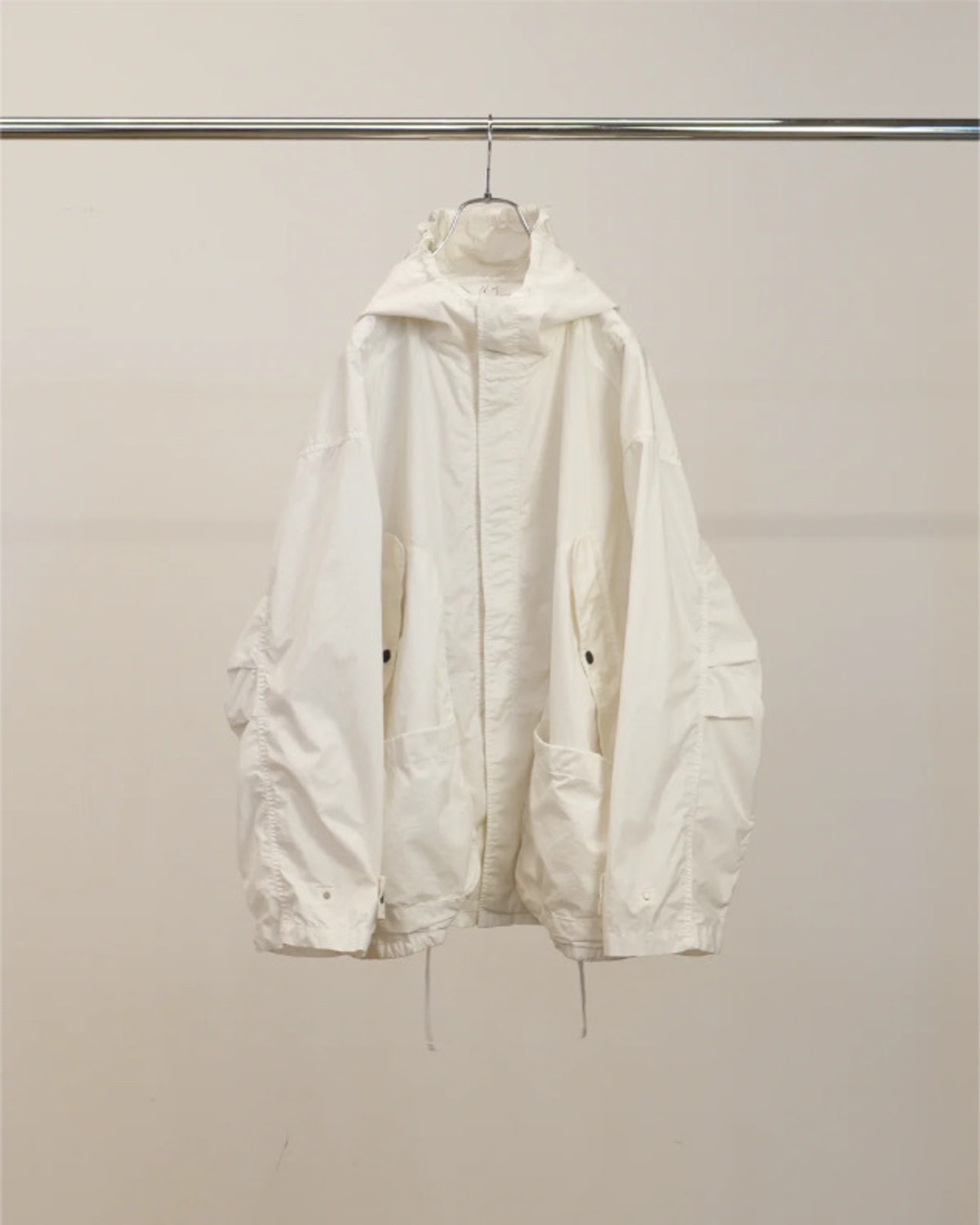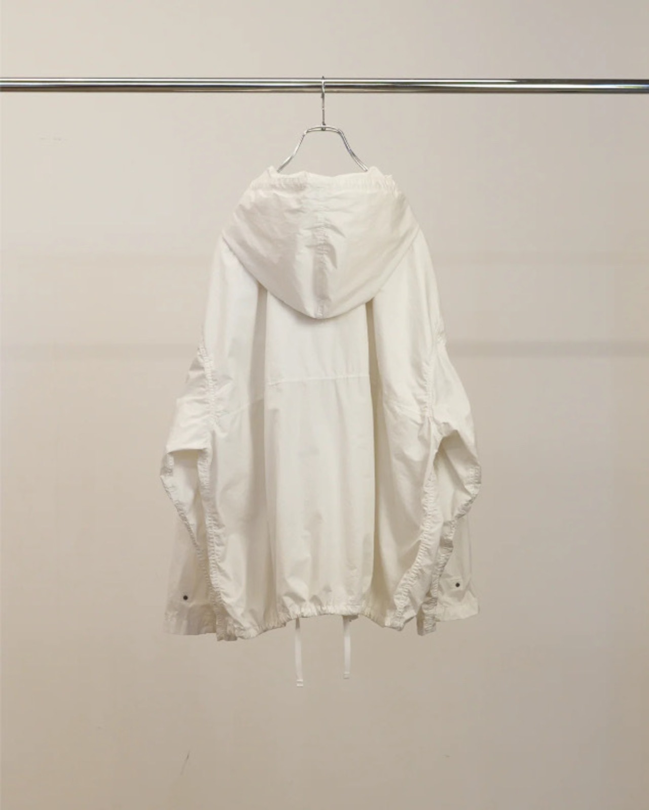 Pulling the drawstrings at the neck and hem creates a crumpled, gathered effect, altering the silhouette. While selecting a material with a solid, nylon-like texture, we felt creating something merely beautiful would be uninteresting.