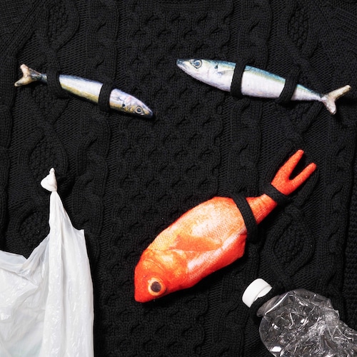 日本由来100%の魚網をリサイクルして生まれたナイロン糸「MURON」を、コットンでカバーリングして編んだフィッシャーマンニット。ケーブル編みが網のように飛び出し、そこに金目鯛やビニール袋、ペットボトルなどが絡みついています。まるで海に漂う漁網のように、命と廃棄物の両方を巻き込む編み目に仕上げました。