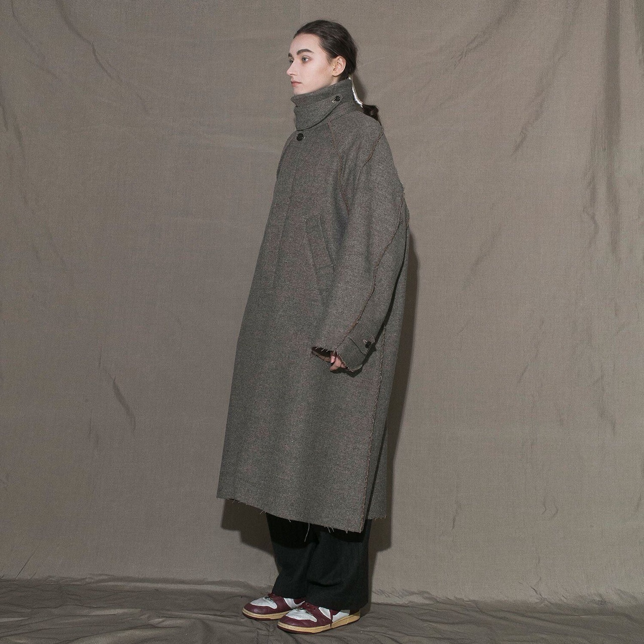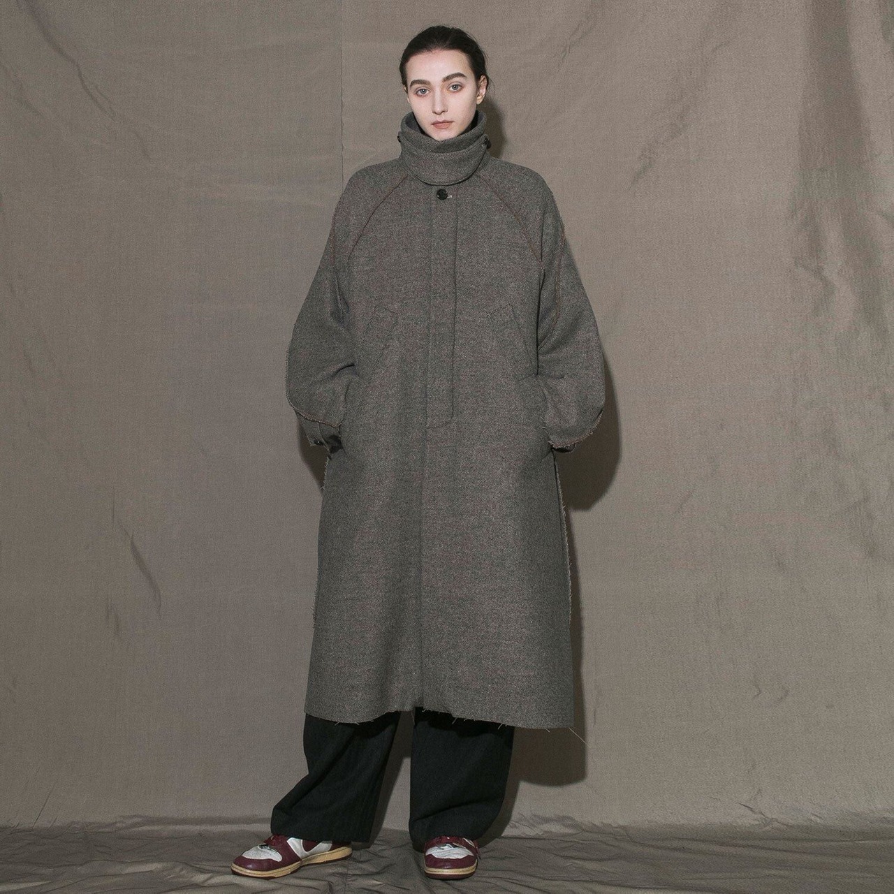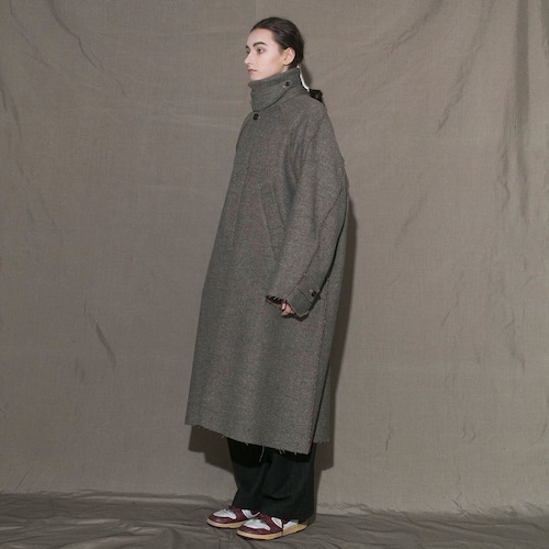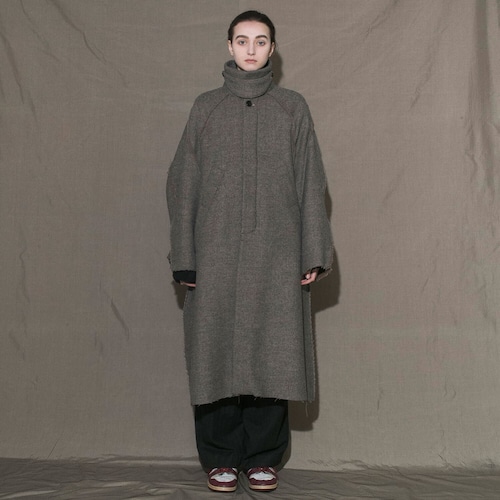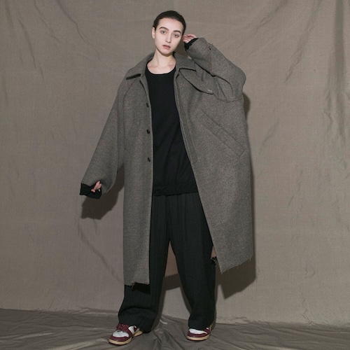立体的なラグランスリーブのオーバーサイズシルエットが特徴のロングコート。