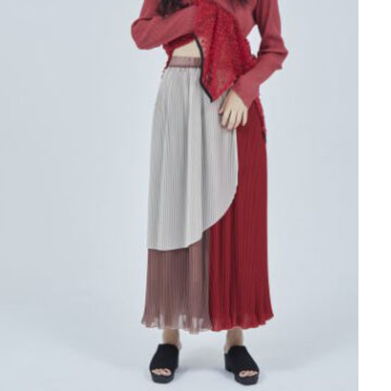 3種類の異なったテキスタイルを組み合わせ、花びらをイメージしたプリーツスカートは、どこを前にしても異なる印象が楽しめるアイテム。ポイントとなるカラーを、その日のスタイリングに合わせて自由自在に楽しめる。