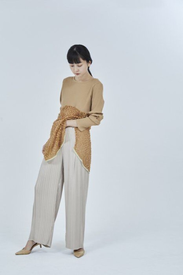 太めのストレートなサイズ感のパンツは、バックの膝下にプリーツを配置した大胆なデザイン。
