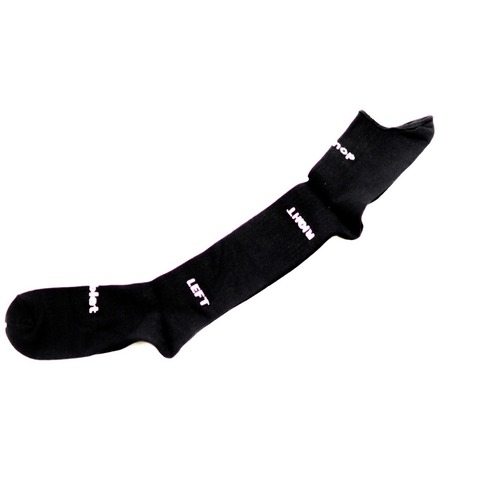 1足の靴下を履き口で編みつなげて、ハイソックスに仕上げたデザイン。履き口は片方の靴下の縫い止め