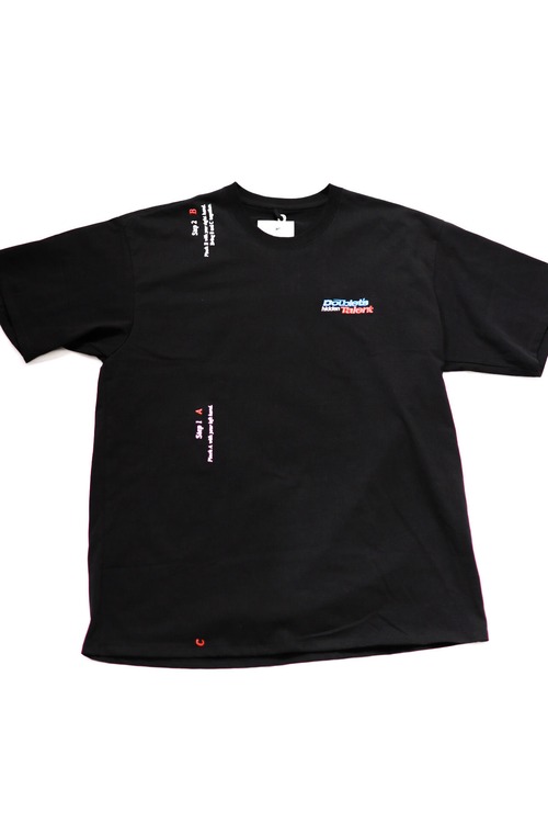 前身頃と後肩に説明の文章の刺繍があります。このSTEP 通りに進行すると2秒でT シャツを畳むことが