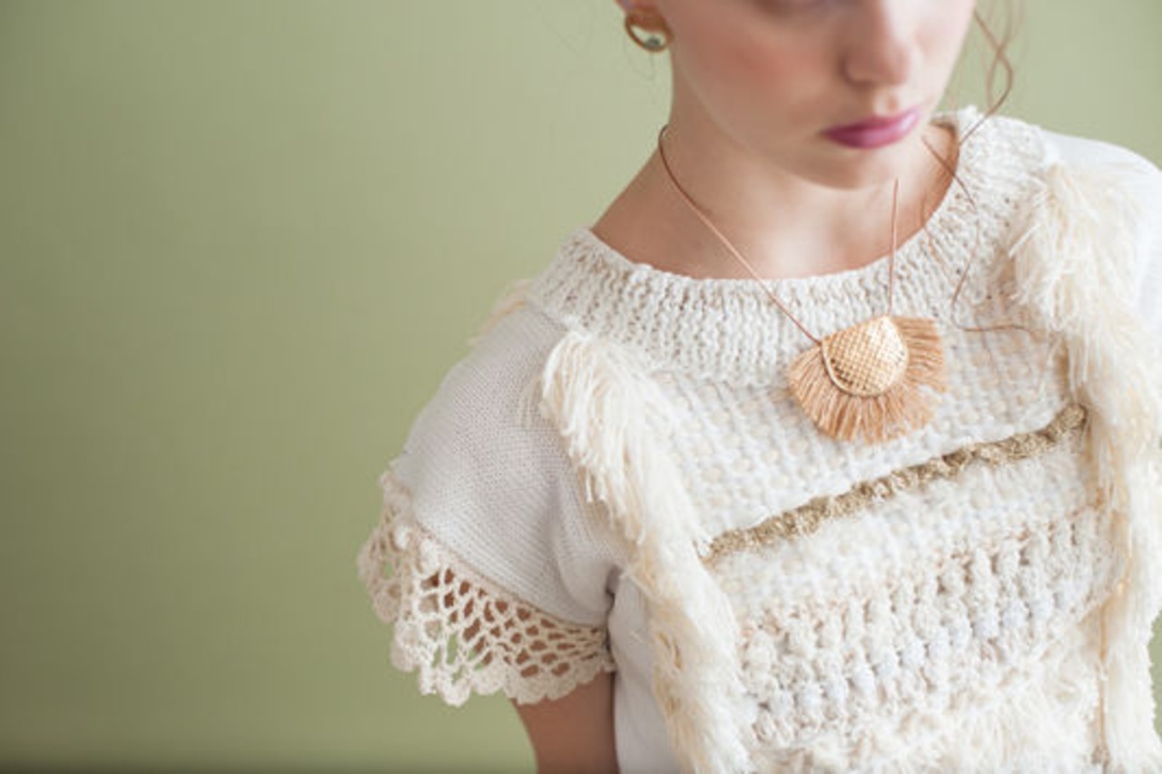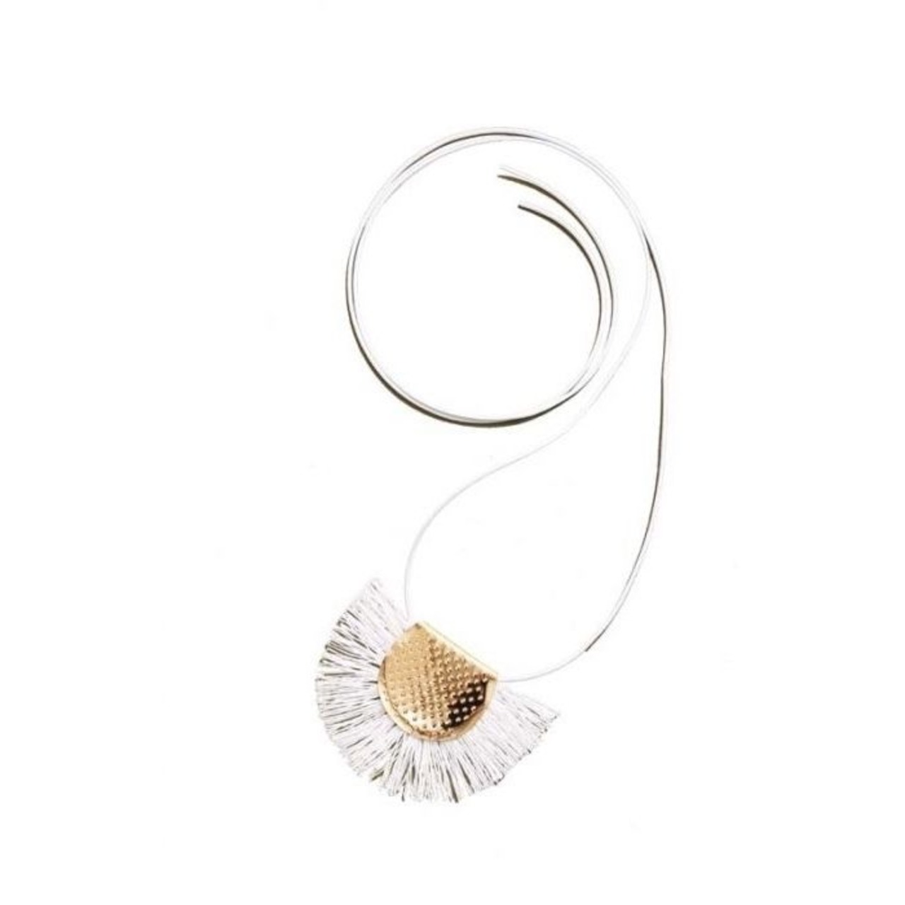 お守りをイメージした有機的なフォルムのモチーフに和紙フリンジを挟み込みエキゾチックなネックレスに。