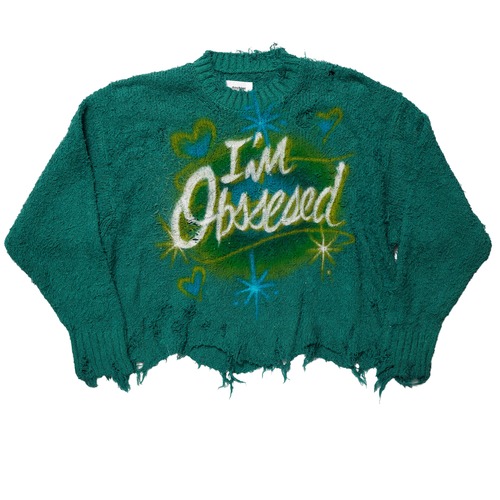 THE FRONT FEATURES THE PHRASE "I'M OBSESSED" AND POPULAR GRAPHICS IN VIBRANT AIRBRUSH ART, EVOKING THE SPIRIT OF FAN ACTIVITIES. EVEN WHEN YOU'RE NOT AT A LIVE EVENT, YOU MIGHT EXPERIENCE THE JOY OF SUPPORTING YOUR FAVORITES IN YOUR DAILY LIFE. WE WILL BE HAPPY TO SUPPORT YOUR UNIQUE FAN ACTIVITIES WITH THIS PULLOVER KNIT.